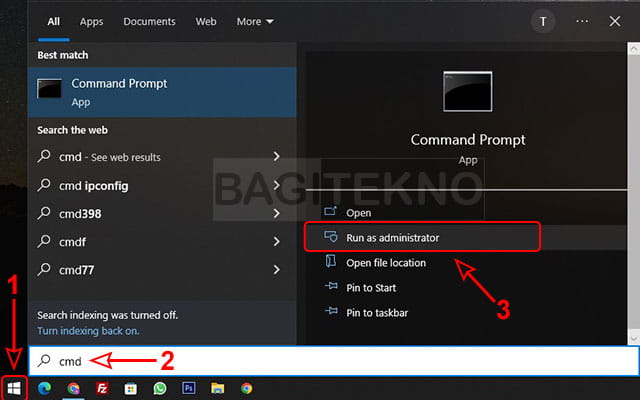 Buka CMD sebagai admin dengan cara klik Start, lalu cari โcmdโ, kemudian klik Run as administrator.